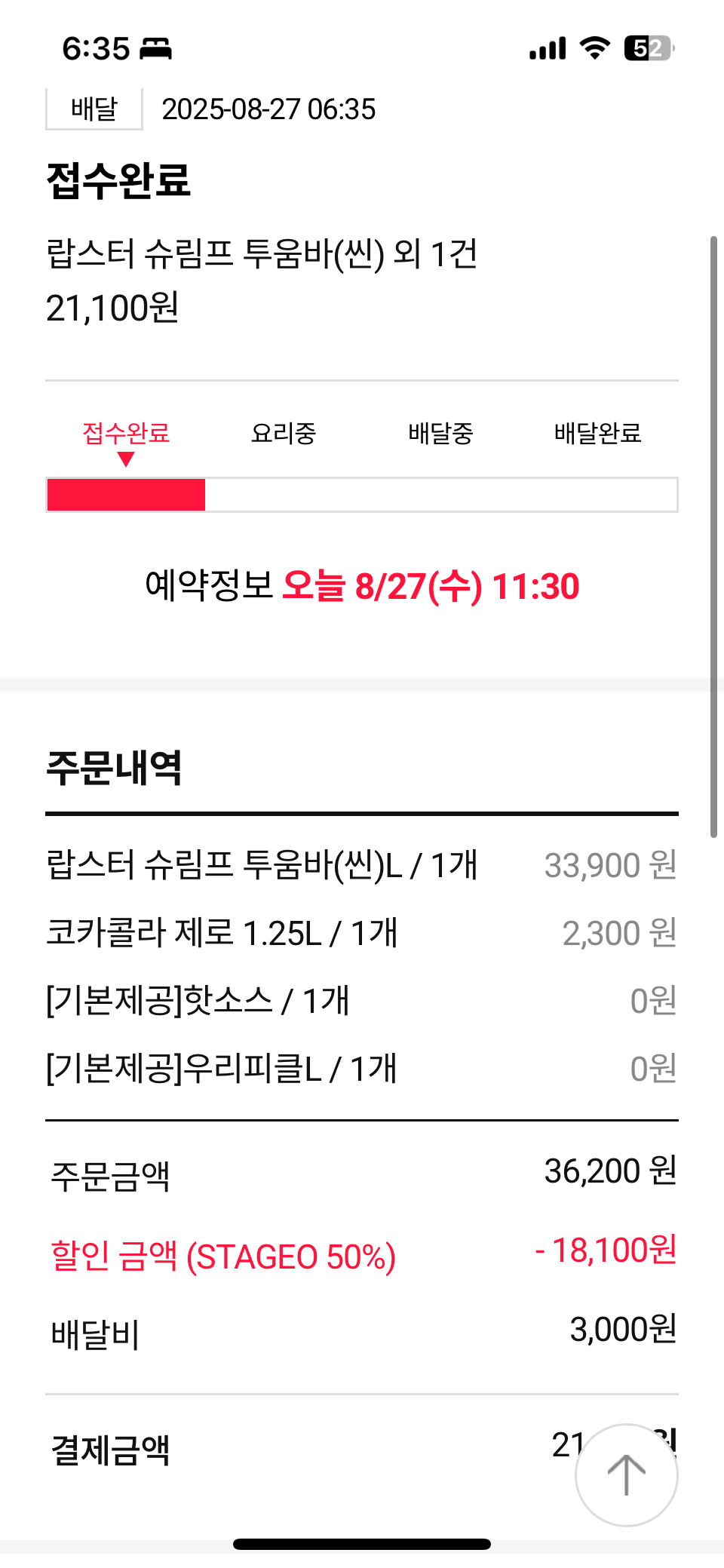 매장 영업 시작 전이지만 앱 접속은 가능하더군요. 아침인데도 대기 인원이 상당했지만, 점심시간에 비하면 훨씬 수월했습니다. T멤버십 앱에서 미리 복사해 둔 쿠폰으로 50% 할인을 적용하고, '오늘 11시 30분'으로 예약 주문을 넣으니 드디어 결제가 완료되었습니다!